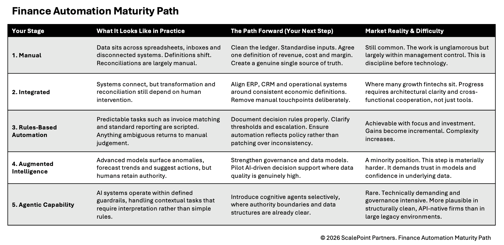 It is more useful to think in stages rather than headlines. Most fintech finance functions sit somewhere between manual and partially integrated. A smaller number have embedded rules-based automation. Fewer still have moved into augmented, model-driven decision support. Genuine agentic capability remains rare. The table below sets out what those stages look like in practice, how they feel inside the team, and what actually moves you forward.